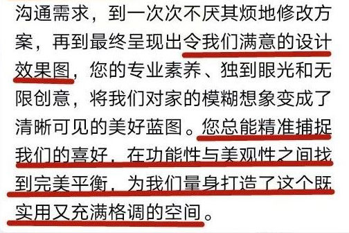 “金杯銀杯不如客戶的口碑”,在裝修界,有一種強大的影響力叫“業(yè)主代言”。南京紅牛裝飾以客戶滿意度作為檢驗家裝質(zhì)量的唯一標(biāo)準(zhǔn),以口碑鑄就品牌力量。因此,收獲了眾多裝修客戶的認可與贊許。